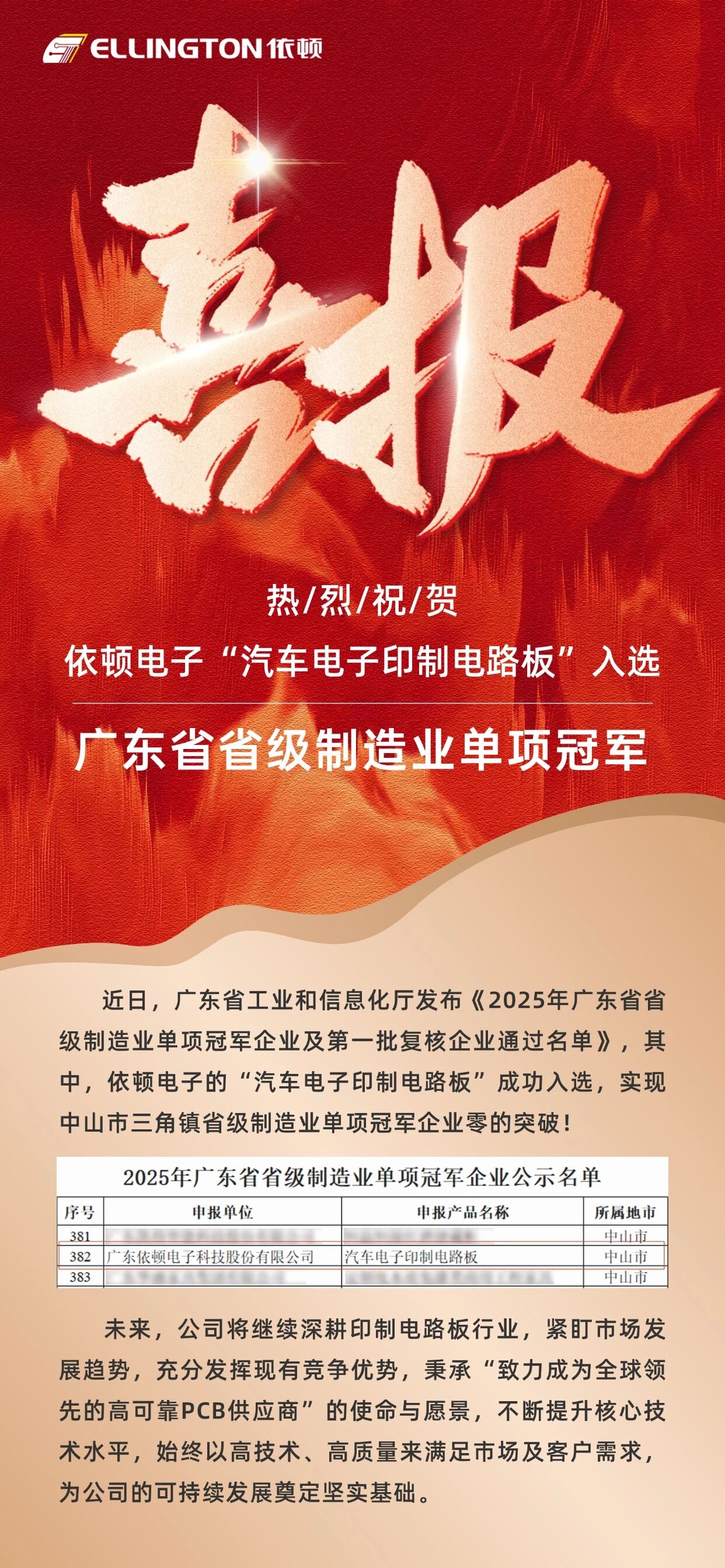 Recently, the Guangdong Provincial Department of Industry and Information Technology released the “List of Provincial-Level Manufacturing Single-Champion Enterprises and the First Batch of Re-evaluated Enterprises in Guangdong Province for 2025.” Among them, Ellington Electronics’ “automotive electronic printed circuit boards” were successfully selected, marking a historic first for Sanjiao Town, Zhongshan City, as it secured its first provincial-level manufacturing single-champion enterprise!